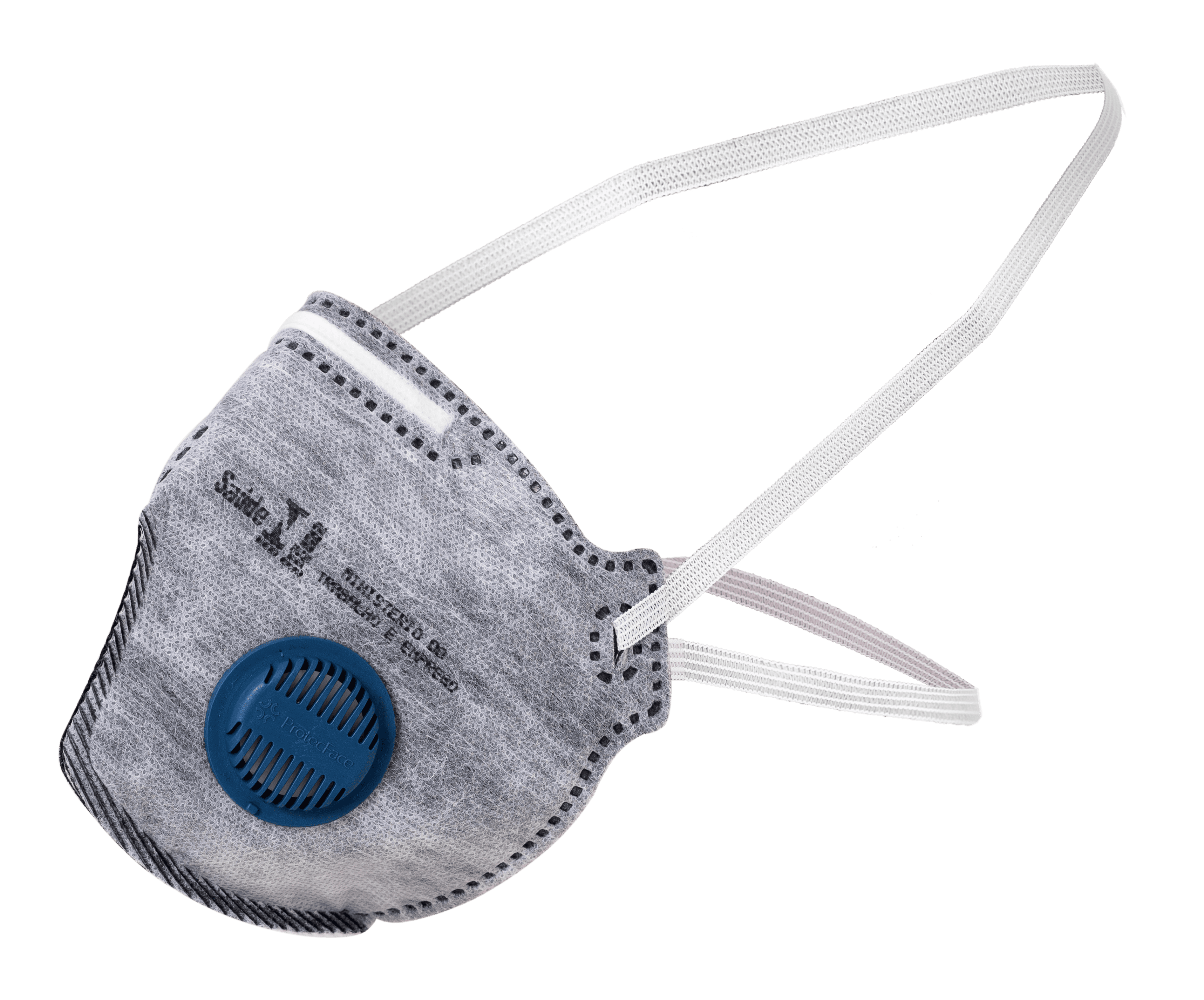 Respirador purificador de ar tipo peça semifacial filtrante para partículas, formato dobrável, com válvula de exalação e manta de carvão ativado, classe PFF2 “S”.
